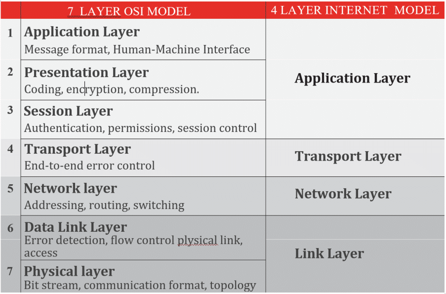 Before going further, it is helpful to review existing internet layers and protocols. The internet is based on TCP/IP communications and operates using the 7 layer OSI model shown in the following chart.